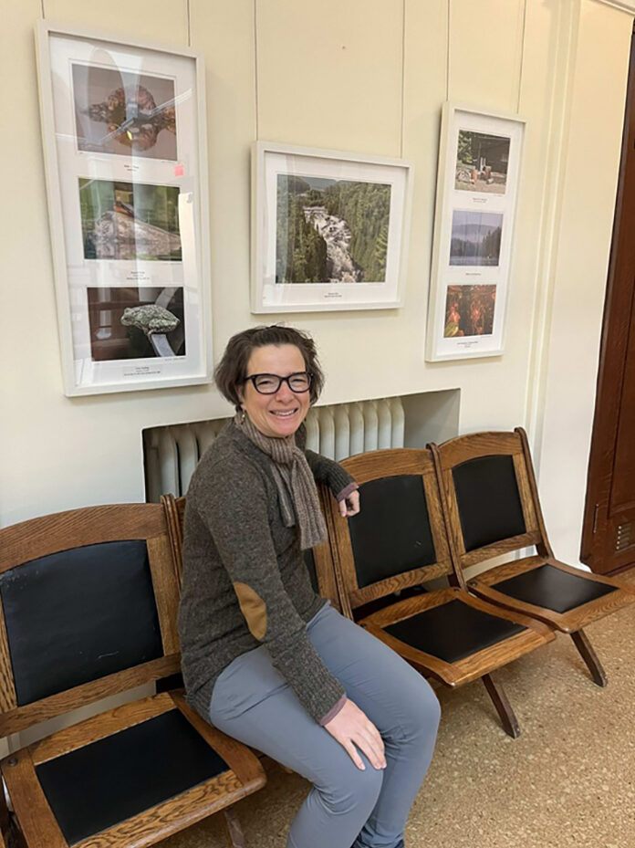 Photo – Jennifer Haughton seated beside her displayed photographs at the CPAWS Dumoine River exhibit in Montreal. (Pam Giroux)