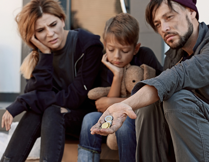 Poor homeless family begging on city street
