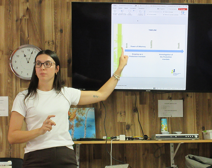 The presentation was led by a two-person team—a social worker and a lawyer—who explained their role in providing free legal information and social support for English-speaking residents of all ages. This first venture into the Pontiac is a satellite initiative of Gatineau-based CJPO (Centre de Justice de Proximité, Outaouais), funded by Justice Quebec and co-hosted by Connexions Resources.