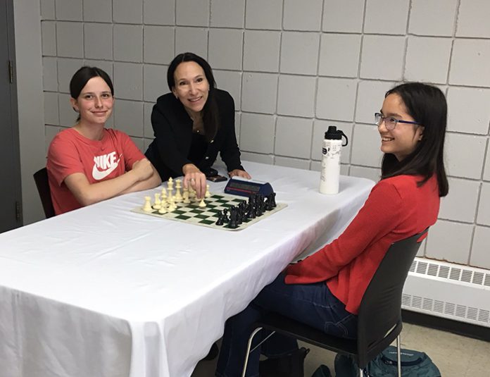 Photo – Teenage chess whiz Denise Tsanov (left) faces opponent Ruby Teehan at the Gatineau Women’s Chess Festival November 16 as Hull MNA Suzanne Tremblay (centre) looks on. (Josée Guénette)